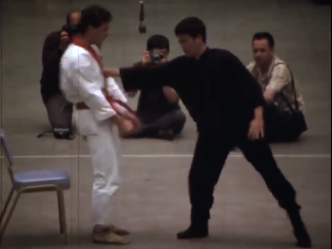 Bruce Lee started off his demonstration by doing a Chi Sao (“Sticky Hands”) demonstration with his friend Taky Kimura. They put their arms together and Lee reacted to Taky’s pressure while blindfolded. Lee eventually brought Taky to the ground.